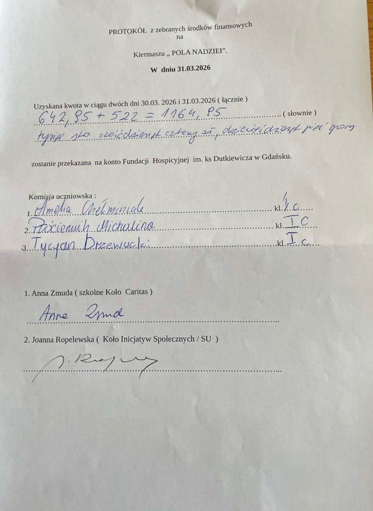 W dniach 30 i 31 marca 2026 r. wolontariusze z naszej szkoły, a jest ich niemało, w ramach akcji Pola Nadziei, pod opieką p. Joanny Ropelewskiej i p. Anny Zmudy, zorganizowali wiosenny kiermasz.